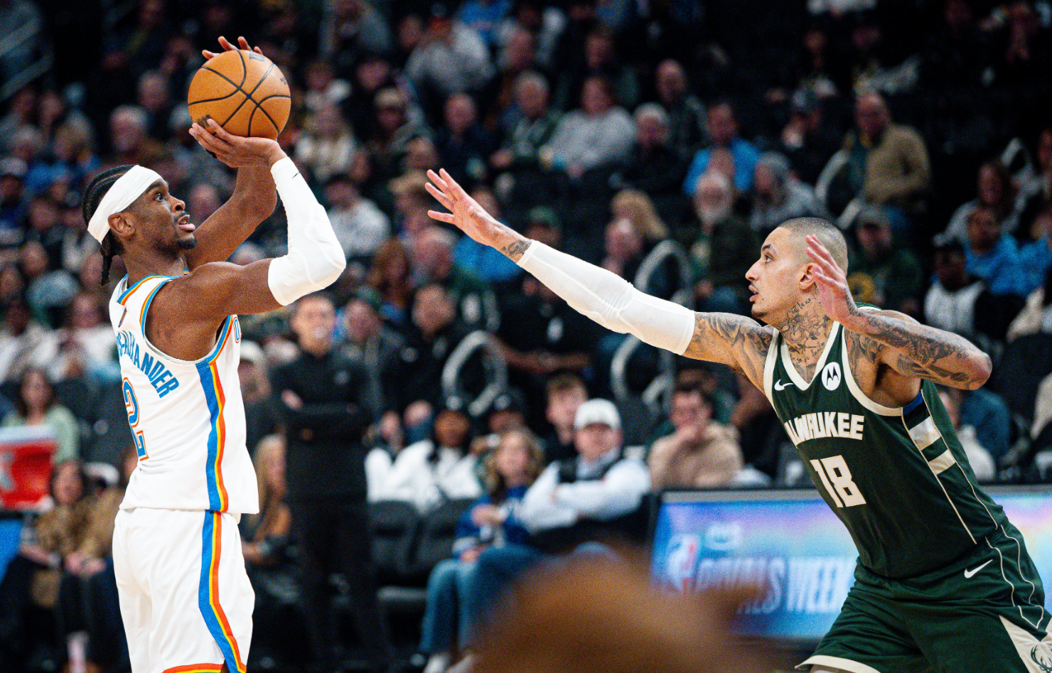 末节雄鹿并没有直接放弃所以SGA再度回归,他无差别单打继续稳住局面,他也完成了40+的得分,