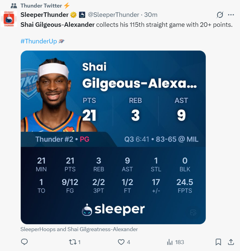 亚历山大此役也达成了连续115场20+的纪录历史第二,他距离1961-1963赛季的张伯伦126场只差15场了。