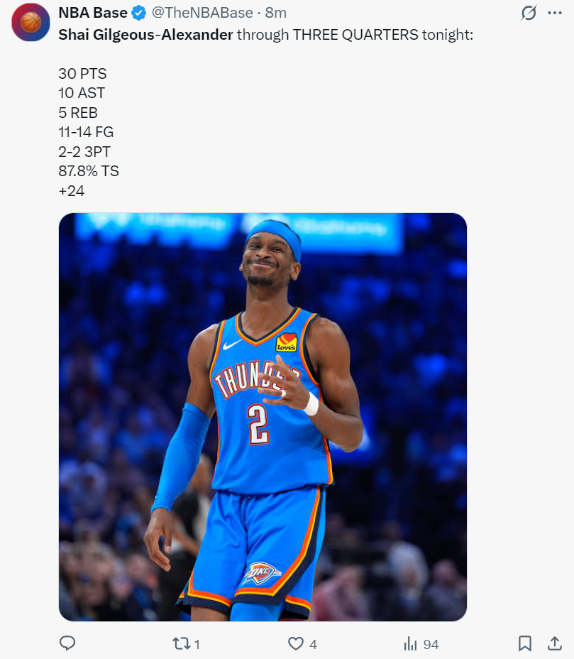 这场比赛的亚历山大是全方位的压制扬尼斯,在短短12分钟里SGA连续送出8个助攻平半场生涯新高:一次给乔、2次给多尔特、2次给肯里奇、1次给切特、2次给卡尔森。亚历山大作为一名1.98米的控球后卫大局观太强大了。