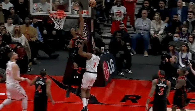 比赛第四节,哈登不惧危险抛投造成干扰球,落地后捂着腰部表情痛苦。